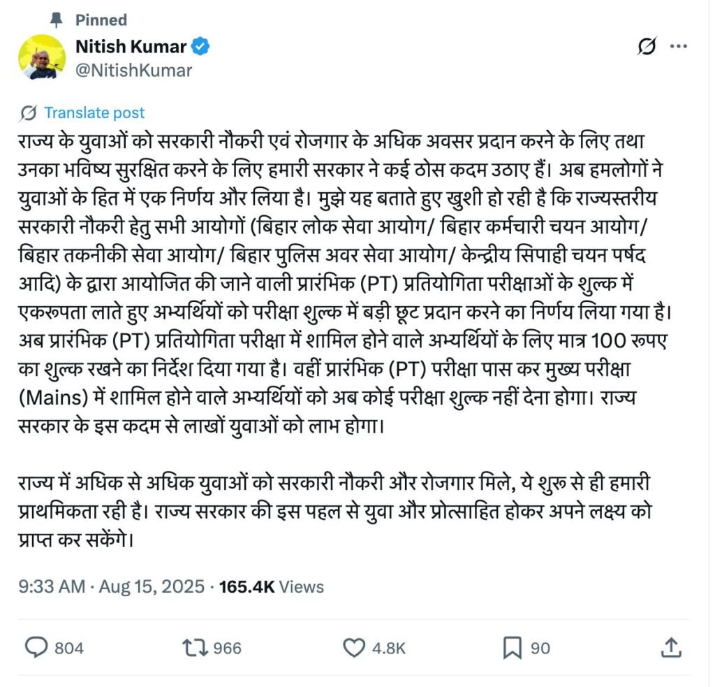 Ans. बिहार सरकार ने राज्य स्तरीय सरकारी नौकरियों की प्रारंभिक (PT) प्रतियोगी परीक्षाओं के शुल्क में बड़ी छूट दी है।