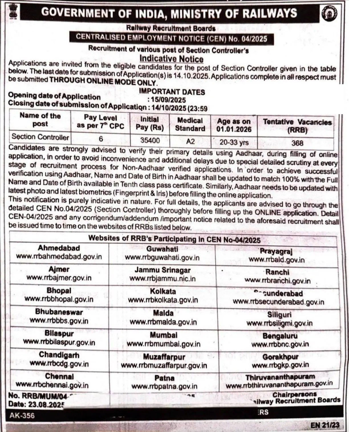 Railway Recruitment Board (RRB), has released a official notification on official website for the recruitment of Section Controller Post. This recruitment is for 368 positions. RRB Application Form has started from 15 September 2025 & the candidates can apply till the 14 October 2025. The Minimum age required is 20 Years & The Maximum Age Is 33 Years as on 01 January 2025. Candidates must check the complete details for RRB Section Controller Recruitment 2025 which has given below.